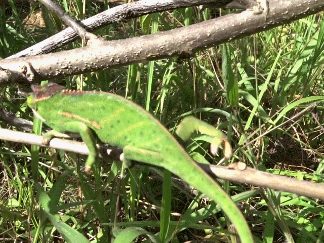 This chameleon is climbing a tree and using his four layers of skin to create a green with red accents.